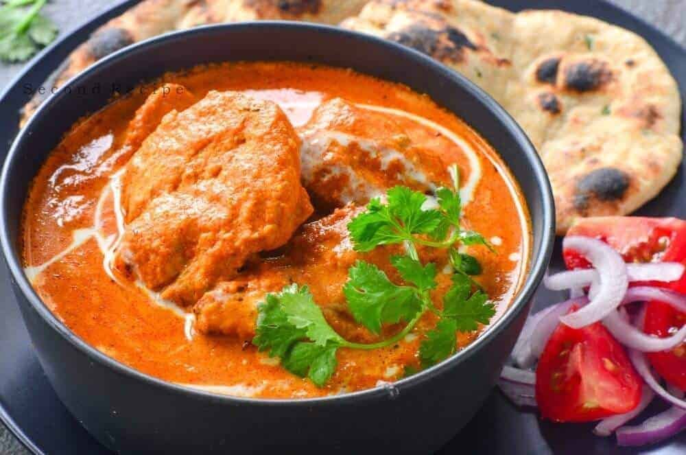 Butter chicken or murgh makhani is a curry of chicken in a spiced tomato, butter and cream sauce. It originated in the Indian subcontinent as a curry. It is similar to chicken tikka masala, which uses a tomato paste.