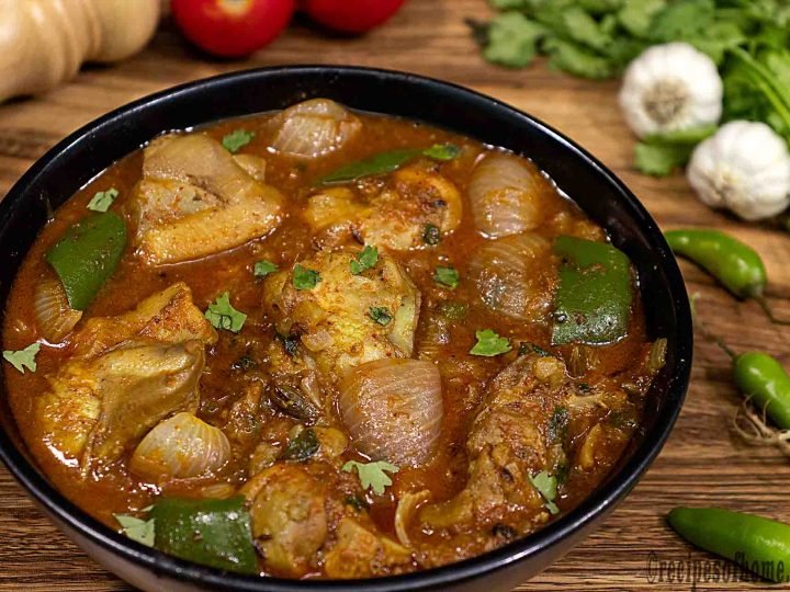 Chicken karahi, or kadai chicken, is a dish from the Indian subcontinent noted for its spicy taste; it is notable in North Indian and Pakistani cuisine. The Pakistani version does not have peppers or onions whereas the North Indian version uses capsicum. The dish is prepared in a karahi.